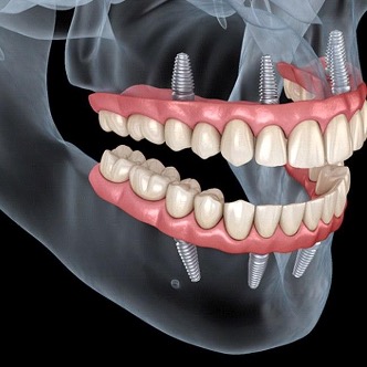 - All-on-Four: Full Arch Dental Implants. All-on-Four dentures replace all your teeth with a permanent set of natural-feeling prosthetics that function exactly like a set of teeth. Permanently affixed to your jaw with titanium screws, they will not shift or slip and do not put unwanted pressure on your gums. Eating and biting are much more comfortable, as they act just as natural teeth do.